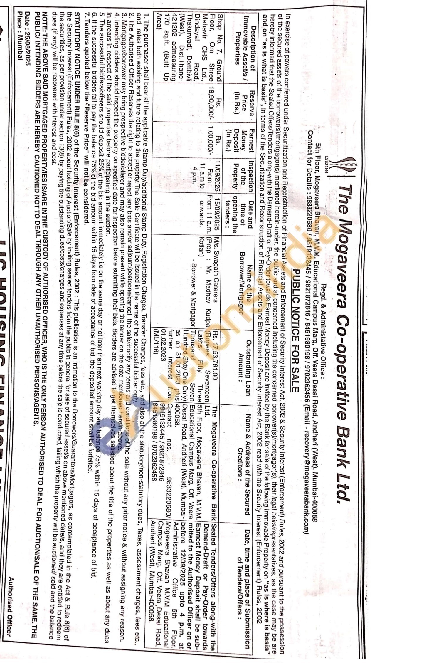 Shop No. 7. Ground Floor, Om Shree Mahavir CHS Ltd., Dindayal Road. Thakurwadi, Dombivli (West), Dist. Thane-421202 admeasuring 170 sq.ft. (Built Up Area