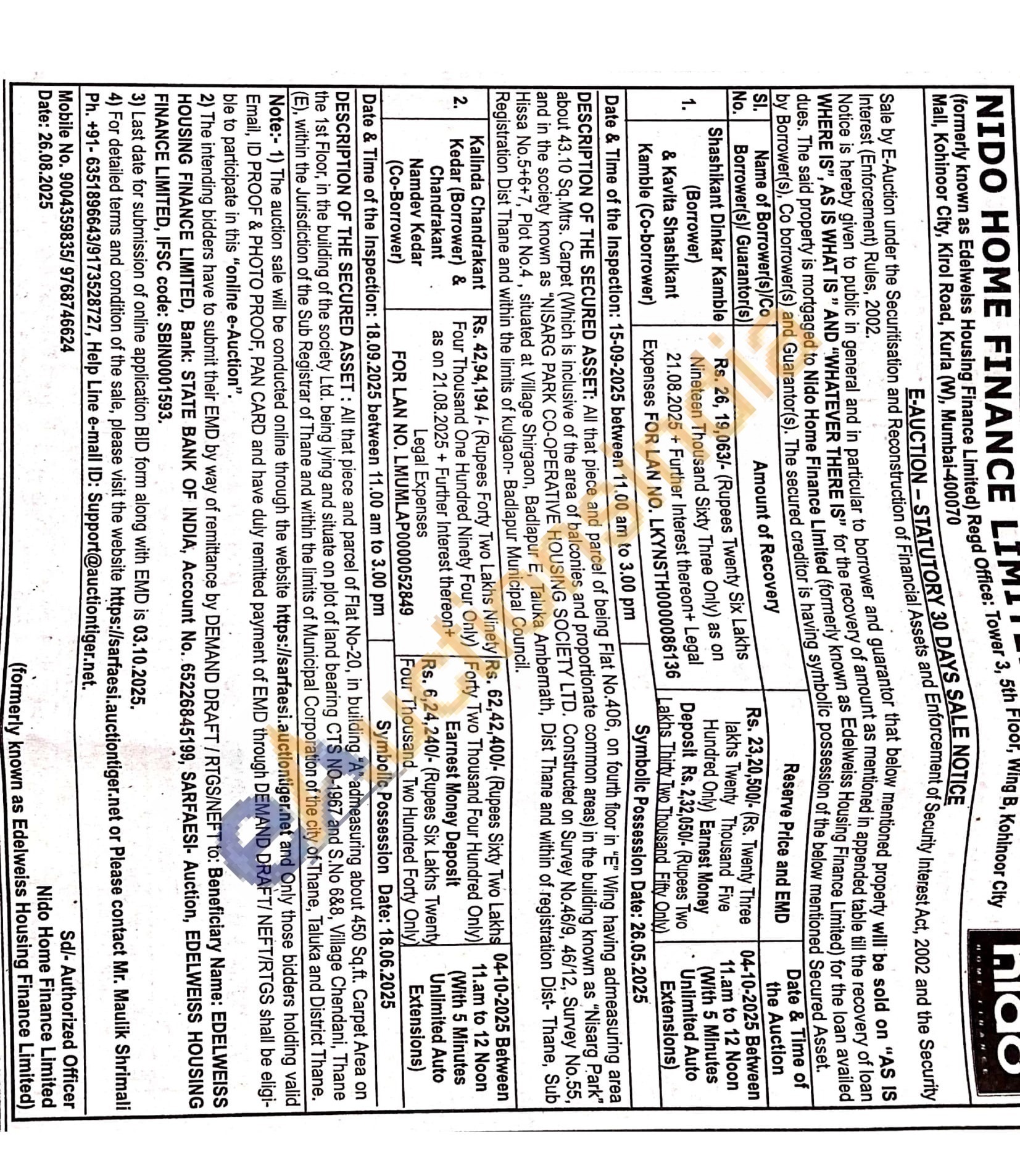 DESCRIPTION OF THE SECURED ASSET: All that piece and parcel of Flat No-20, in building "A" admeasuring about 450 Sq.ft. Carpet Area on the 1st Floor, in the building of the society Ltd. being lying and situate on plot of land bearing CTS NO-1967 and S.No 6&8, Village Chendani, Thane (E), within the Jurisdiction of the Sub Registrar of Thane and within the limits of Municipal Corporation of the city of Thane, Taluka and District Thane.