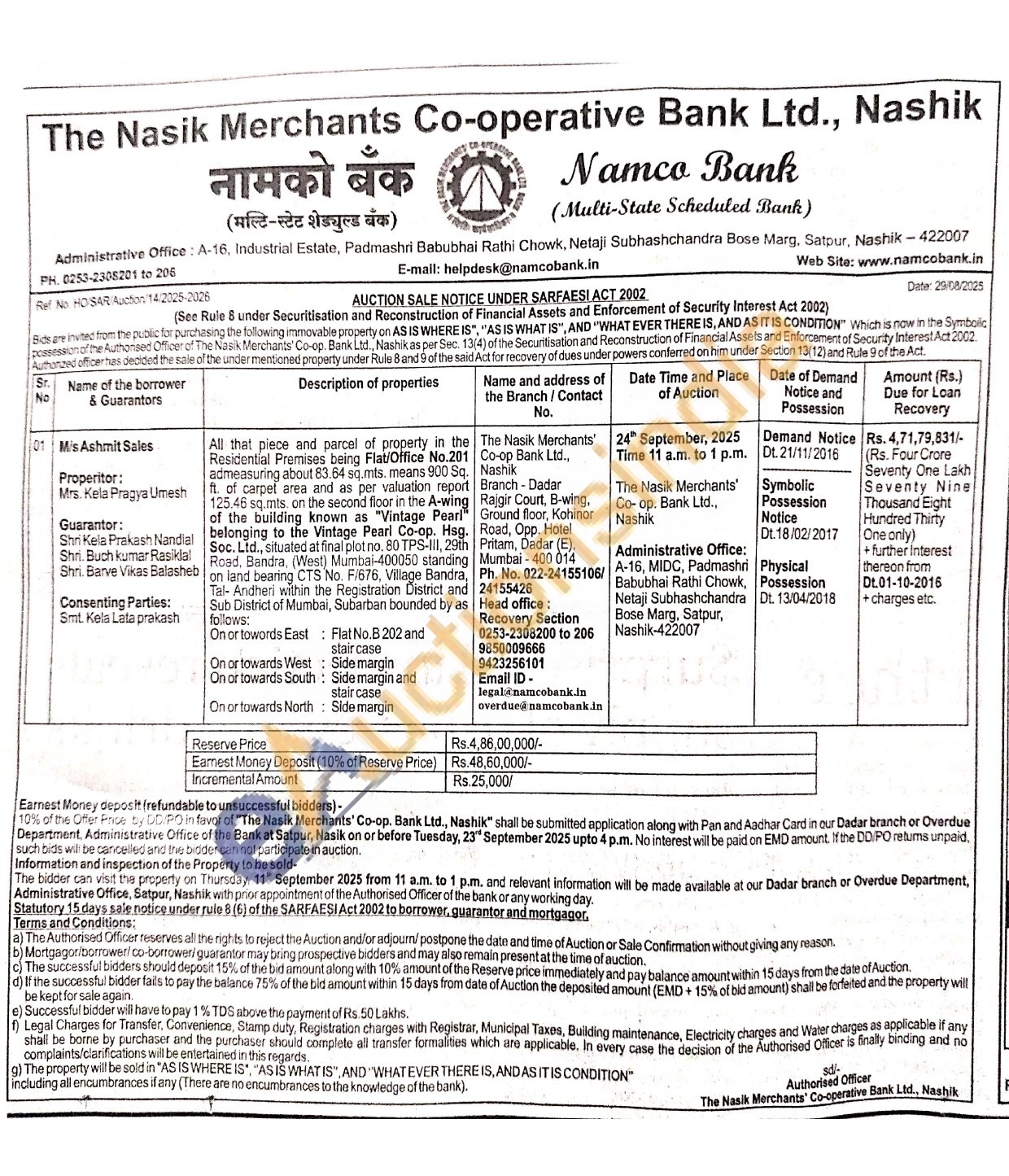 All that piece and parcel of property in the Residential Premises being Flat/Office No.201 admeasuring about 83.64 sq.mts. means 900 Sq. ft. of carpet area and as per valuation report 125.46 sq.mts. on the second floor in the A-wing of the building known as "Vintage Pearl" belonging to the Vintage Pearl Co-op. Hsg Soc. Ltd., situated at final plot no. 80 TPS-III, 29th Road, Bandra, (West) Mumbai-400050 standing on land bearing CTS No. F/676, Village Bandra, Tal- Andheri within the Registration District and Sub District of Mumbai, Subarban bounded by as follows: On or towords East: On or towards West On or towards South Flat No.B 202 and stair case Side margin Side margin and On or towards North staircase Side margin