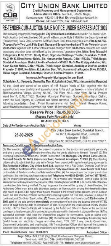 Schedule-A: (Property Owned by Mrs. K. Lakshmi Devi, W/o, Hanumantha Ragudu) : All that piece and parcel of an extent of 165 Square Yards of Site together with the superstructure now existing and superstructures to be put up thereon in future situated in Thimmanacheria Village, Survey No.190. Old Ward No.9. New Ward No.13, Present Ward No.17, D.No.17/532, Guntakal Municipal Premises, Guntakal, Anantapur District, within the Sub-Registry of Guntakal and within Revenue District of Anantapur within the following boundaries: East: Pinjari Hussainamma Hut, South Marati Mareppa House, West: Maddikera Akula Lelamma's Hut, North: 15 feet wide Road