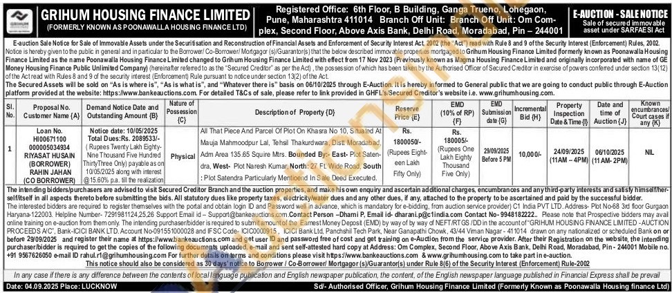 All That Piece And Parcel Of Plot On Khasra No 10, Situated At Mauja Mahmoodpur Lal, Tehsil Thakurdwara, Distt Moradabad, Adm Area 135.65 Squire Mtrs. Bounded By:- East- Plot Saten-dra, West- Plot Naresh Kumar, North: 27 Ft. Wide Road, South : Plot Satendra Particularly Mentioend In Sale Deed Executed