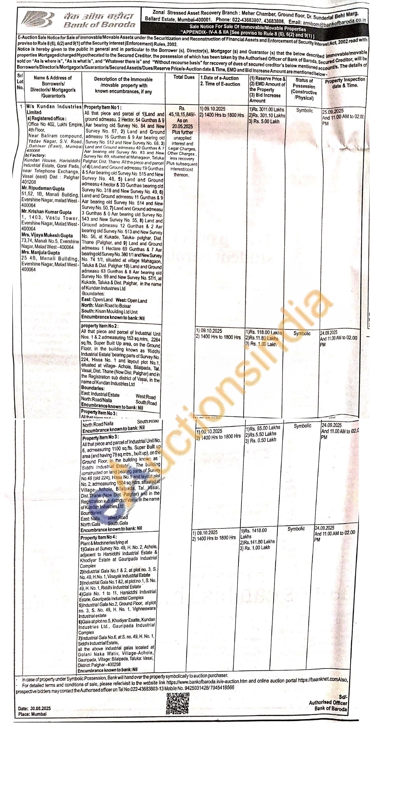 All that piece and parcel of Industrial Unit Nos. 1 & 2 admeasuring 153 sq.mtrs, 2264 sq.fts, Super Built Up area, on the Ground Floor, in the building known as 'Riddhi Industrial Estate bearing parts of Survey No. 224, Hissa No. 1 and layout plot No.1, situated at village- Achole, Bilalpada, Tal. Vasal, Dist. Thane (Now Dist. Palghar) and in the Registration sub district of Vasai, in the name of Kundan Industries Ltd