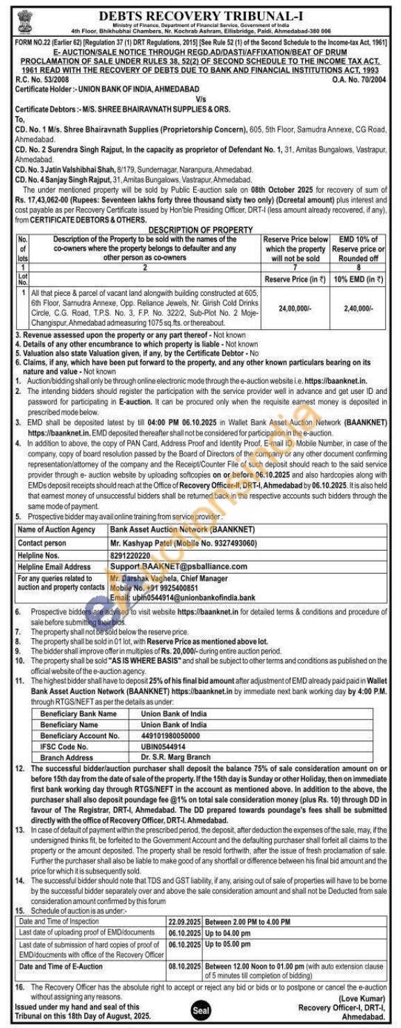 All that piece & parcel of vacant land alongwith building constructed at 605 6 Floor. Samudra Annexe, Opp. Reliance Jewels, Nr. Ginah Cold Drinks Crede, C.G. Reat. TPS. No. 3. FP No. 322/2, Sub-Plot No. 2 Moje Changispur Ahmedabad admeasuring 1075 sq fts or thereabout