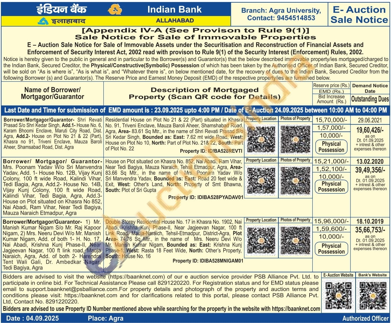 Residential House on Plot No 21 & 22 (Part) situated in Khasra No. 91, Triveni Enclave, Mauza Baroli Aheer, Shamshabad Road, Agra, Area- 83.61 Sq Mtr., in the name of Shri Revati Prasad S/o Sri Kedar Singh, Bounded as: East: 7.62 mt wide Road, West: House on Plot No 10, North: Part of Plot No. 21& 22, South: Part of Plot No. 22