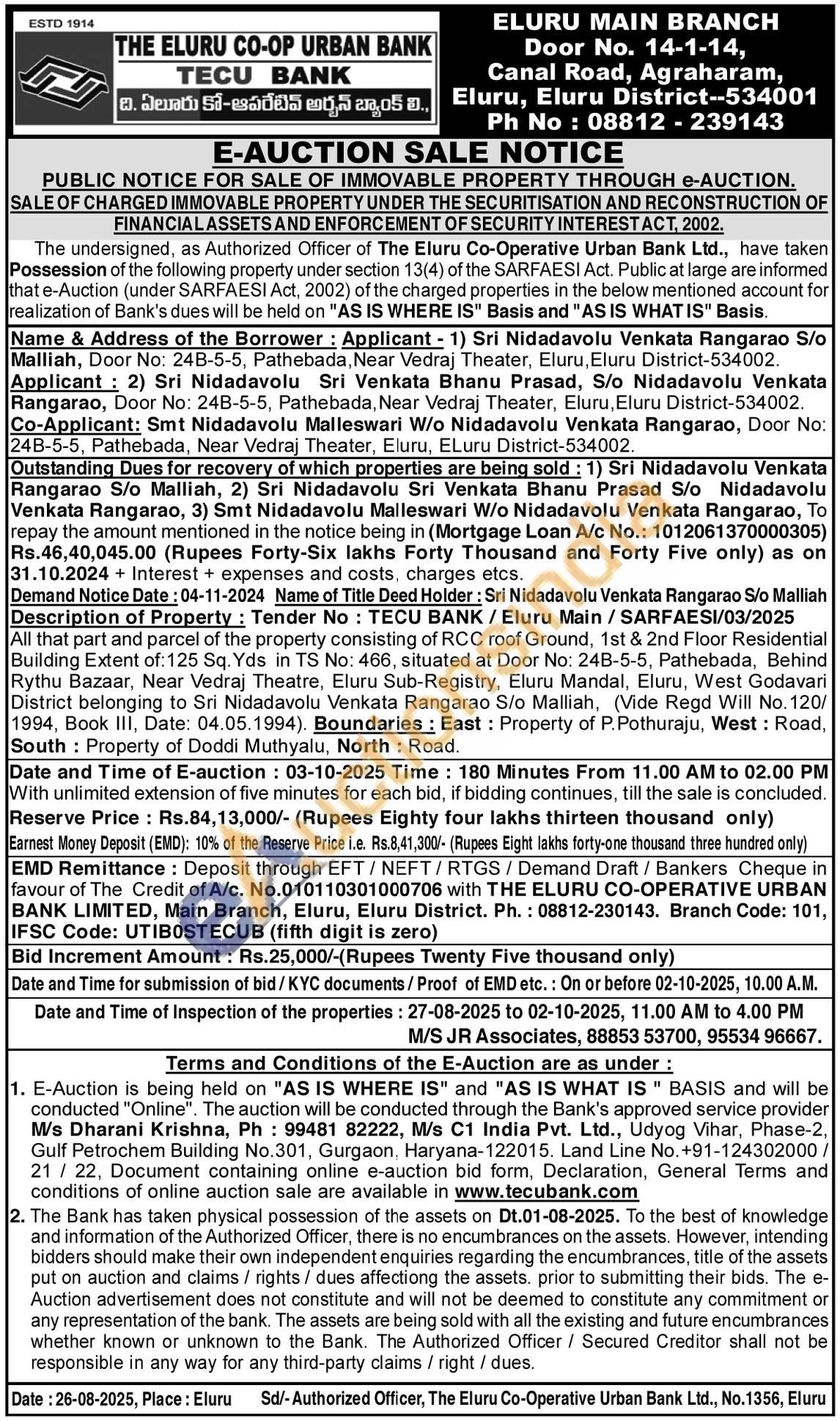 Description of Property: Tender No: TECU BANK / Eluru Main/SARFAESI/03/2025