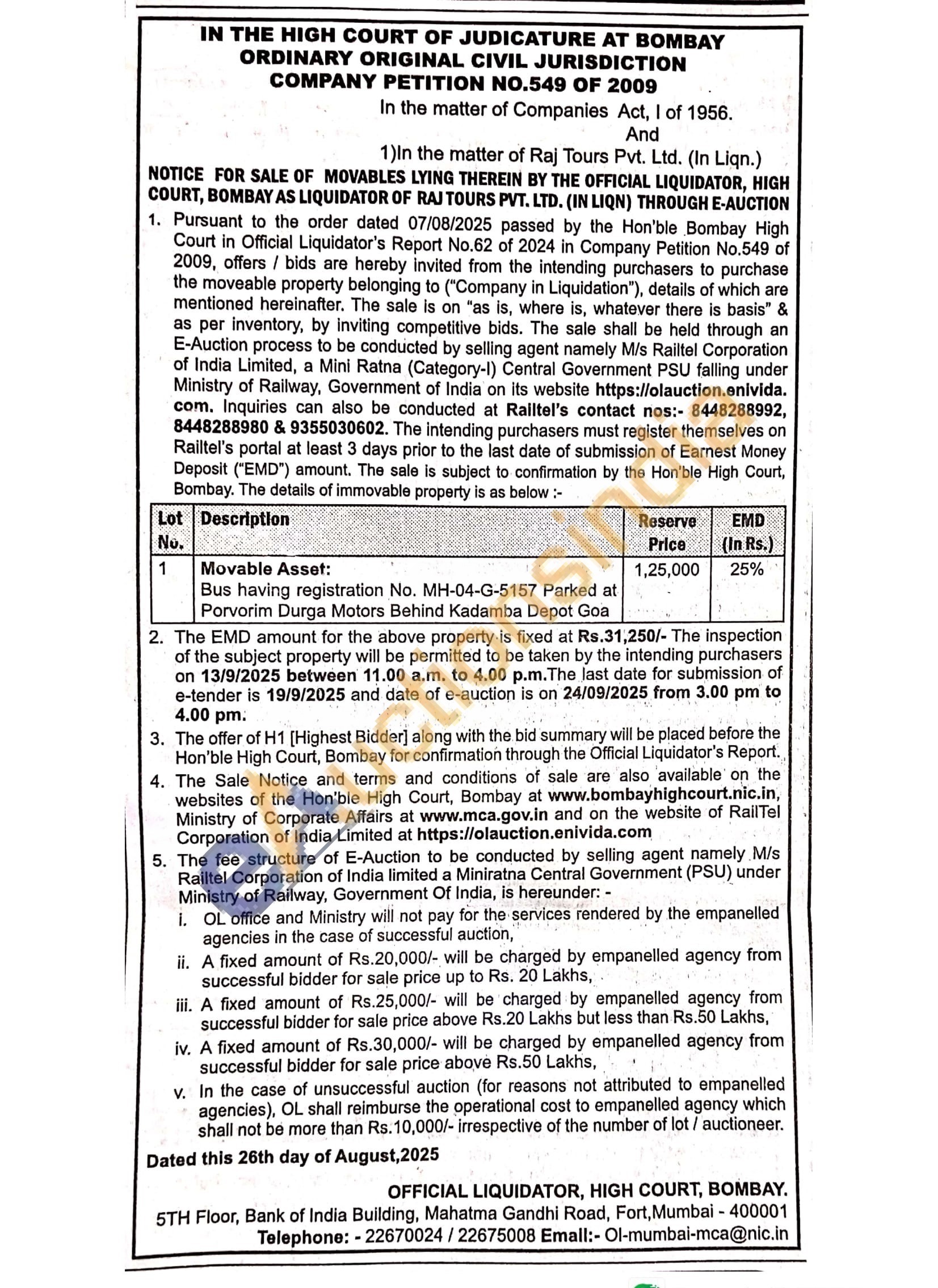 Movable Asset:Bus having registration No. MH-04-G-5157 Parked at Porvorim Durga Motors Behind Kadamba Depot Goa