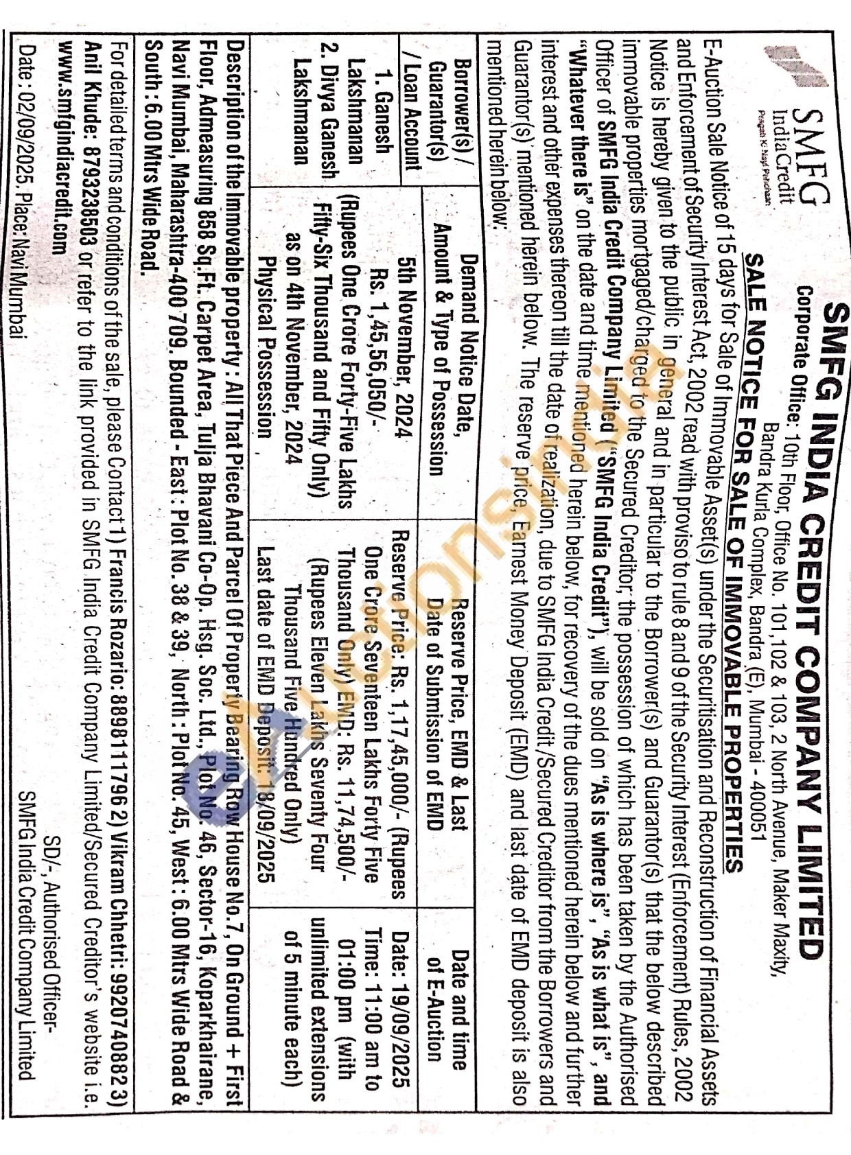 Description of the Immovable property: All That Piece And Parcel Of Property Bearing Row House No.7, On Ground + First Floor, Admeasuring 858 Sq.Ft. Carpet Area, Tulja Bhavani Co-Op. Hsg. Soc. Ltd., Plot No. 46, Sector-16, Koparkhairane, Navi Mumbai, Maharashtra-400 709. Bounded-East: Plot No. 38 & 39, North: Plot No. 45, West: 6.00 Mtrs Wide Road & South: 6.00 Mtrs Wide Road.......
