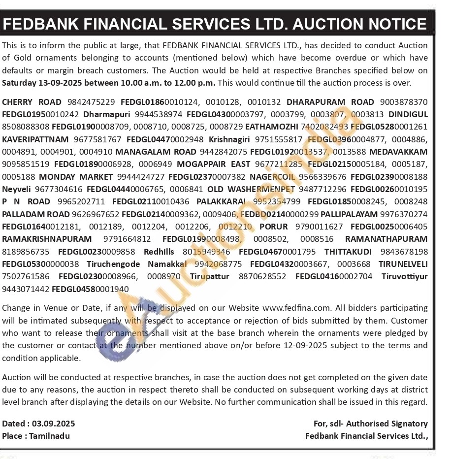Fedbank Financial Services Ltd Gold Auctions Auction in Tirunelveli