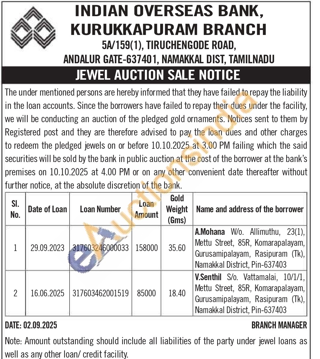 Indian Overseas Bank Gold Auctions Auction in Namakkal