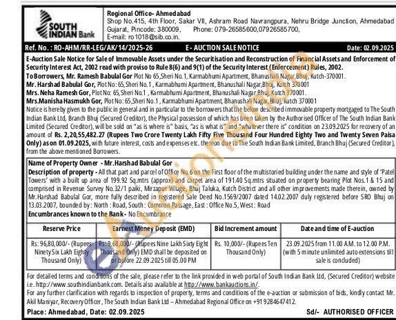 All that part and parcel of Office No.6 on the First floor of the multistoried building under the name and style of 'Patel Towers' with a built up area of 199.92 Sq.mtrs (approx) and carpet area of 191.40 Sq.mtrs situated on property bearing Plot Nos. 1 & 15 and comprised in Revenue Survey No.32/1 paiki, Mirzapur Village, Bhuj Taluka, Kutch District and all other improvements made therein, owned by Mr.Harshad Babulal Gor, more fully described in registered Sale Deed No.1569/2007 dated 14.02.2007 duly registered befare SRO Bhuj on 13.03.2007, bounded by: North: Road, South: Common Passage, East: Office No.5, West: Road