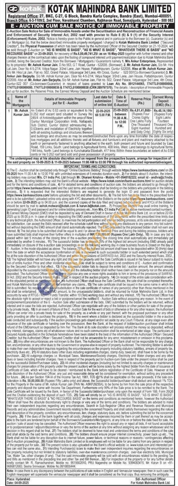 An Extent of Ac 0.63 cents or equivalent to He 0.252 roof vacant land situated in Survey No 245/4 of Ankireddypalem within the area of New Guntur Municipal Corporation limits, Nallapadu Sub District, Guntur district admeasuring Ac. 0.63cents and installation of Electricity together with all existing buildings and structures thereonand buildings and structures as may be erected/constructed there upon any time from/after the date of respec tive mortgages and all additions thereto and all fixtures and furniture's and plant and machinery attached to the earth or permanently fastened to anything attached to the earth, both present and future and bounded by East: Road, 159 Links, South. Land belongs to Agricultural forms, 408 links, West: Land belongs to Agricultural forms, 144 links, North: Land belongs to Kunchakarla Elizebath, 417 links Within these boundaries an extent of Ac 0.63 cents or He 0.252 roof land sold and given possession of property