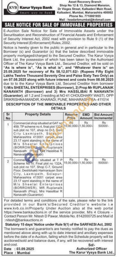 Commercial shop situated at T P Scheme No IV. Final plot no 132A, sub plot no 107, Shop C-7, Ground Floor, Deshbhakti Harinarayan Soni City, Laxmipeth, Solapur-Maharashtra 413001 carpet area 23.17 sqmt standing in the name of M/s Sheetal Enterprises (BORROWER). MR Ruplanaik Nanavath (Prop), Mrs Hasslibai R Nanavath (Guarantor)