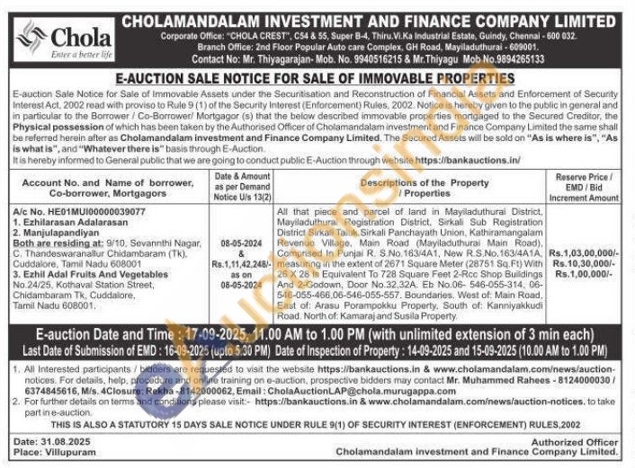 All that piece and parcel of land in Mayiladuthural District, Mayiladuthurai Registration District, Sirkali Sub Registration District Sirkali Taluk, Sirkali Panchayath Union, Kathiramangalam Revenue Village, Main Road (Mayiladuthurai Main Road), Comprised In Punjai R. S.No. 163/4A1, New R.S.No. 163/4A1A, measuring in the extent of 2671 Square Meter (28751 Sq. Ft) With 26 X 28 is Equivalent To 728 Square Feet 2-Rcc Shop Buildings And 2-Godown, Door No.32,32A. Eb No.06-546-055-314, 06-546-055-466,06-546-055-557. Boundaries, West of Main Road, East of: Arasu Porampokku Property, South of: Kanniyakkudi Road. North of: Kamaraj and Susila Property