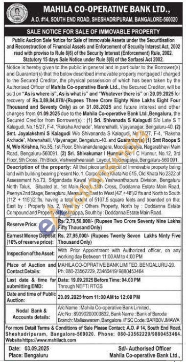 Description of the property: All that piece and parcel of immovable property being land with building bearing present No. 1, Corporation Khata No 515, Old Khata No 2322 of Assessment No.73. Srigandada Kawal Village, Yeshwanthapura Division, Bengaluru North Taluk, Situated at, 1st Main Road, 18th Cross, Doddanna Estate Main Road, Peenya 2nd Stage, Benagluru, Measuring East to West (42'+46)/2 fts and North to South (112+115)/2 fts, having a total extent of 5107.5 square feets and bounded on the East by Property No. 2, West by Others Property, North by Doddanna Estate Compound and Property of Krishnappa, South by: Doddanna Estate Main Road