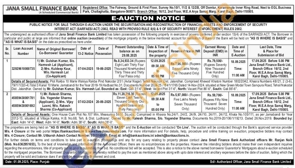Details of Secured Assets: Plot Rakba 10 Marle Wakiya Rakba Pind Nakodar 2/31 (Avtar Nagar) Tehsil Nakodar Dist. Jalandhar. Comprised Khewat/ Khatoni Number 1802/2042, Khasra Numbers 48//21, 2 (3-6), 79//1/1/2(0-4) Total 3 Kanal 10 Marle. Jamabandi for the Year 2018-19.Hadbast No.31. Documents Number 2024-25/184/1/1765 Dated 14-Nov-2024. situated at New Green Modal Town Sarvpura Road, Tehsil Nakodar Dist. Jalandhar, Owned by Mr. Gulshan Kumar, S/o. Harmesh Lal. Bounded as: East: Gali 31'-6", West: Vacant Plot 31'-6", North: Vacant Plot 86'-6', South: Gali 86-6".