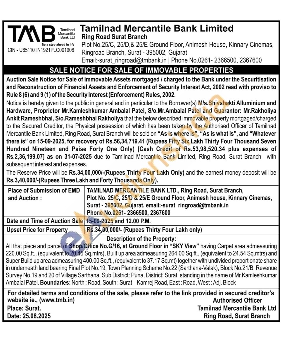 All that piece and parcel of Shop/Office No.G/16, at Ground Floor in "SKY View" having Carpet area admeasuring 220.00 Sq.ft., (equivalent to 20.45 Sq.mtrs), Built up area admeasuring 264.00 Sq.ft., (equivalent to 24.54 Sq.mtrs) and Super Build up area admeasuring 400.00 Sq.ft., (equivalent to 37.17 Sq.mt) together with undivided proportionate share in underneath land bearing Final Plot No. 19, Town Planning Scheme No.22 (Sarthana-Valak), Block No.21/B, Revenue Survey No. 19 and 20 of Village Sarthana, Sub District: Puna, District: Surat, standing in the name of Mr.Kamleshkumar Ambalal Patel. Boundaries: North: Road, South: Surat-Kamrej Road, East: Road, West: Adj. Block