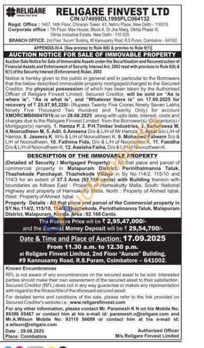 (Detailed of Security / Mortgaged Property): All that piece and parcel of commercial property in Malapuram District, Perinthalmanna Taluk, Thazhekode Panchayat, Thazhekode Village in Sy No. 114/2, 115/10 and 114/3 for an extent of 37.3 Ares (92.168 cents) with Building thereon with boundaries as follows East: Property of Hamsakutty Malla, South: National Highway and property of Hamsakutty Malla, North Property of Ahmed Iqbal, West: Property of Ahmed Iqbal.