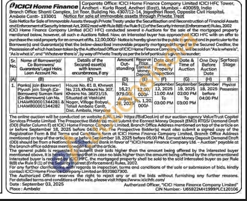 House No. 61 B. Khewat No. 215, Khatouni No. 307, Khasra No. 36/21/15. Situated at Vashisht Nogar, Villoge Bobyol, Tehsil Ambala Cantt, Dist. Ambala, Haryana