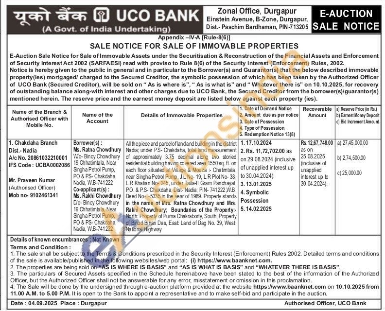 All the piece and parcel of landand building in the district Nadia; under P.S- Chakdaha, total land measurement of approximately 3.75 decimal along two storied residential building having covered area 1550 sq. ft. on each floor situated at Village & Mouza: Chatimtala, near Singha Petrol Pump, J.L No- 19, L.R Plot No-38, L.R Khatian No- 245, under Tatla-II Gram Panchayat, P.O. & P.S- Chakdaha, Dist- Nadia: PIN-741222,W.B. Deed No-1-5335 in the year of 1989. Property stands in the name of Mrs. Ratna Chowdhury and Mrs. Rakhi Chowdhury Boundaries of the Property:-North: Property of Purna Chakraborty, South: Property of Binod Bihari Das, East Land of Dag No. 39, West: National Highway