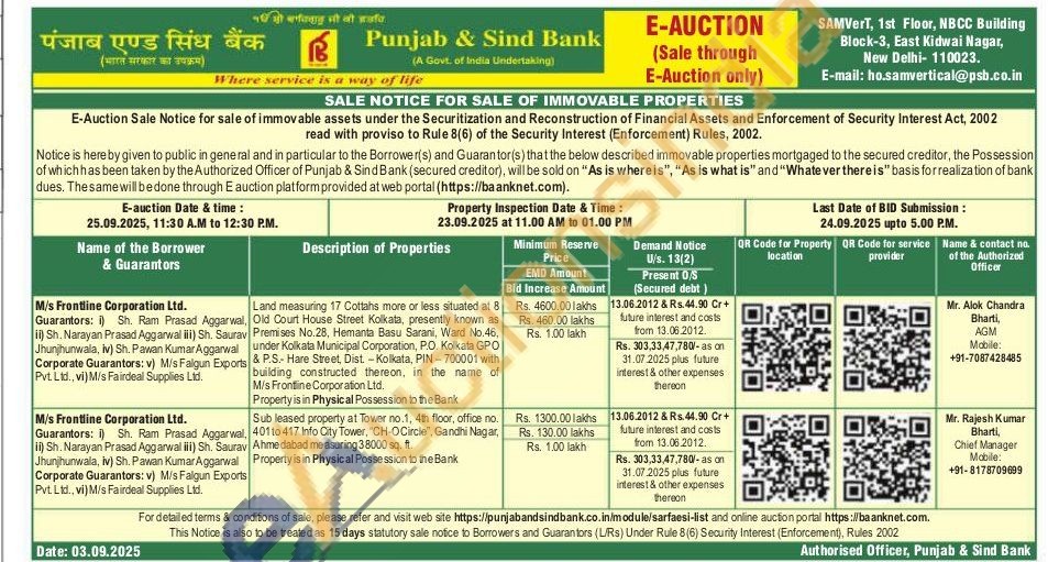 Land measuring 17 Cottahs more or less situated at 8 Old Court House Street Kolkata, presently known as Premises No.28, Hemanta Basu Sarani, Ward No.46, under Kolkata Municipal Corporation, P.O. Kolkata GPO & P.S.- Hare Street, Dist.- Kolkata, PIN-700001 with building constructed thereon, in the name of M/s Frontline Corporation Ltd.