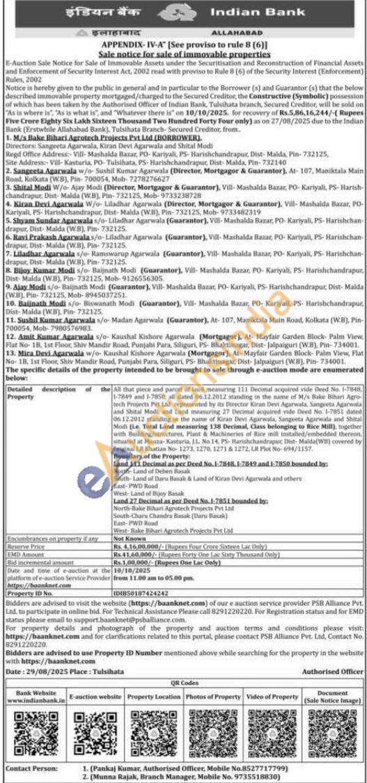 All that piece and panel of land measuring 111 Decreal sopared vide Deed No. 7 1789 and 1-7856 all dated 06.12.2012 standing is the name of M/s Bake Bihari Agro-tech Projects Pvt. Lad represented by its Doctor Gran Dest Agarwola, Sangrets Agarwoda and Shital Modi, and Land masuring 27 Decimal acquired vide Deed No. 1-7851 dated 06.12.2012 standing in the name of Kiran Dess Agarwals, Sangeeta Agrwal and Shal Madi Total Land measuring 138 Decimal, Class belonging to Rice Mill), together with Building/structures, Plant & Machineries of Rice will installed/enhedded thereon. situated at Mouza- Каsтата, 13. № 14, 25-Harishchandrapur, Dist-Malda
