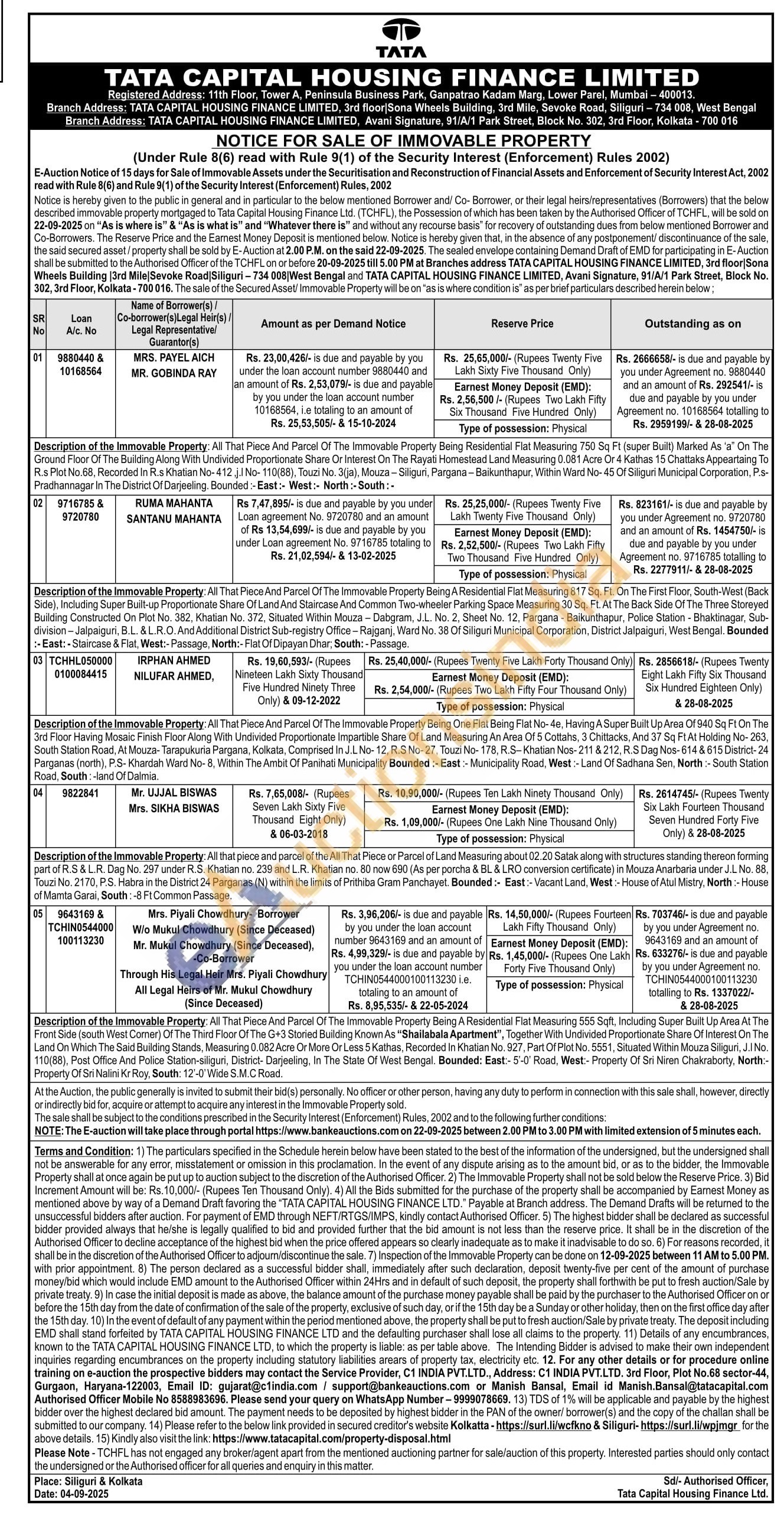 Description of the Immovable Property: All That Piece And Parcel Of The Immovable Property Being Residential Flat Measuring 750 Sq Ft (super Built) Marked As 'a" On The Ground Floor Of The Building Along With Undivided Proportionate Share Or Interest On The Rayati Homestead Land Measuring 0.081 Acre Or 4 Kathas 15 Chattaks Appeartaing To R.s Plot No.68, Recorded In R.s Khatian No-412.j.I No-110(88), Touzi No. 3(ja), Mouza - Siliguri, Pargana-Baikunthapur, Within Ward No- 45 Of Siliguri Municipal Corporation, P.s-Pradhannagar In The District Of Darjeeling. Bounded:- East:- West: North :- South