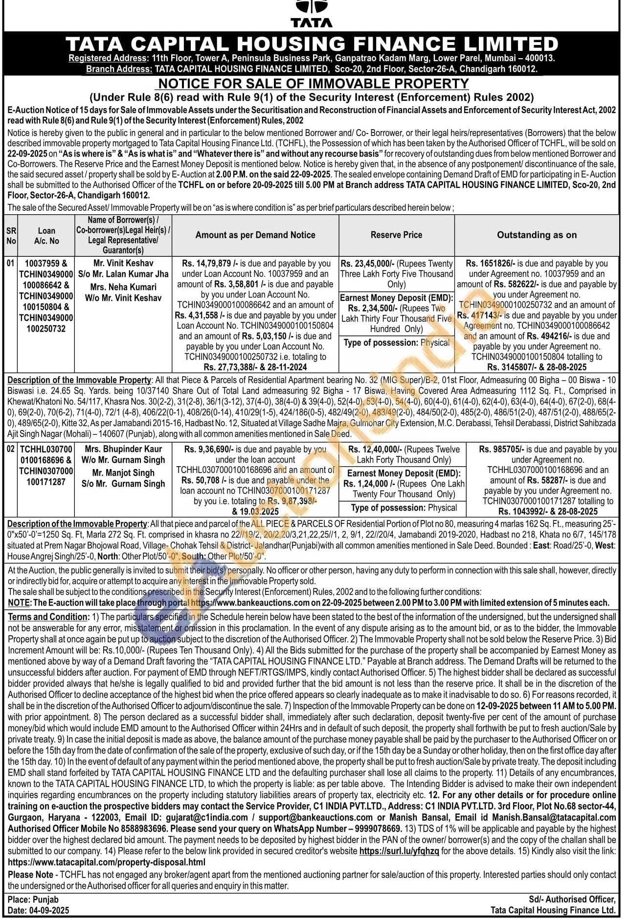 Description of the Immovable Property: All that Piece & Parcels of Residential Apartment bearing No. 32 (MIG Super)/B-2, 01st Floor, Admeasuring 00 Bigha-00 Biswa - 10 Biswasi i.e. 24.65 Sq. Yards. being 10/37140 Share Out of Total Land admeasuring 92 Bigha 17 Biswa, Having Covered Area Admeasuring 1112 Sq. Ft., Comprised in Khewat/Khatoni No. 54/117, Khasra Nos. 30(2-2), 31(2-8), 36/1(3-12), 37(4-0), 38(4-0) & 39(4-0), 52(4-0), 53(4-0), 54(4-0), 60(4-0), 61(4-0), 62(4-0), 63(4-0), 64(4-0), 67(2-0), 68(4-0), 69(2-0), 70(6-2), 71(4-0), 72/1 (4-8), 406/22(0-1), 408/26(0-14), 410/29(1-5), 424/186(0-5), 482/49(2-0), 483/49(2-0), 484/50(2-0), 485(2-0), 486/51(2-0), 487/51(2-0), 488/65(2-0), 489/65(2-0), Kitte 32, As per Jamabandi 2015-16, Hadbast No. 12, Situated at Village Sadhe Majra, Gulmohar City Extension, M.C. Derabassi, Tehsil Derabassi, District Sahibzada Ajit Singh Nagar (Mohali)-140607 (Punjab), along with all common amenities mentioned in Sale Deed