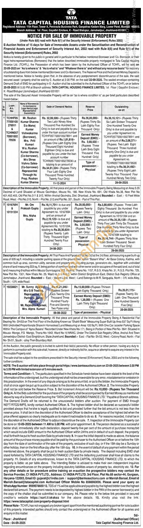 Description of the Immovable Property: All that piece and parcel of the Immovable Property Being A Residential Flat Bearing No- SH/03 on The First Floor of the Bulding Known as "Shakti Block" Measuring Super Built Up Area 537 Sq Ft Along With Undivided Proportionate Share in Homestead Land Measuring an Area 100 Sq Ft. With One Car/scooter Parking Space Within The Campus of "Apna Basera" Recorded Under New Khala No-171, Being in Portion of New Plot No-3641 Situated in Mouza-Mango, P.S Mango, Thana No-1642. Ward No-10 MNAC, Under The District Sub Registry Office, Anchal And Town Jameshdpur District-East Singhbhum, State Jharkhand. Bounded: East: Flat No-Sh/02. West: Colony Road, North: Flat No-Sh/01, South-alley Then Boundary Wall
