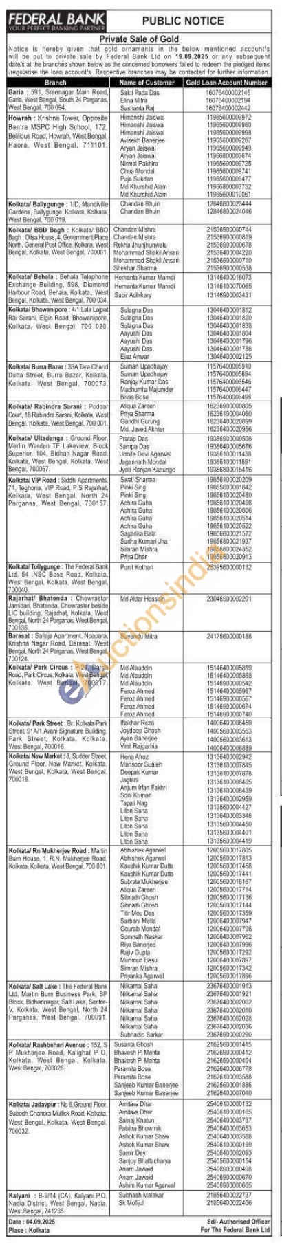 Federal Bank Gold Auctions Auction in Kolkata