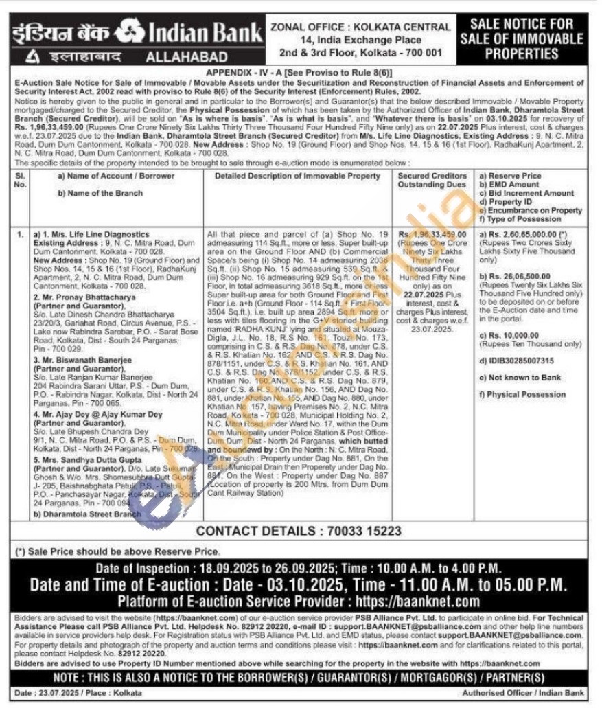 All that piece and parcel of (a) Shop No. 19 admeasuring 114 Sq.ft., more or less, Super built-up area on the Ground Floor AND (b) Commercial Space's being (1) Shop No. 14 admeasuring 2036 Sq.ft. (ii) Shop No. 15 admeasuring 539 Sq.ft. & () Shop No. 16 admeasuring 929 Sq.ft. on the 1st Floor, in total admeasuring 3618 Sq.ft., more or less Super built-up area for both Ground Floor and First Floor Le a+b (Ground Floor-114 Sq.ft. First Floor-3504 Sq.ft.), Le built up area 2894 Sq.ft. more or less with tiles flooring in the G+V storied building named RADHA KUNJ lying and situated at Mouza-Digla, J.L. No. 18, R.S No. 161, Touzi No. 173. comprising in C.S. & R.S. Dag No. 878, under C.S. & R.S. Khatian No. 162, AND C.S. & R.S. Dag No. 878/1151, under C.S. & R.S. Khatian No. 161, AND C.S. & R.S. Dag No. 878/1152, under C.S. & R.S. Khatian No. 160 AND C.S. & R.S. Dag No. 879, under C.S. & R.S. Khatian No. 156, AND Dag No. 881, under Khatian No. 155, AND Dag No. 880, under Khatian No. 157, having Premises No. 2. N.C. Mitra Road, Kolkata-700 028, Municipal Holding No. 2, N.C. Mitra Road, under Ward No. 17, within the Dum Dum Municipality under Police Station & Post Office-Dum Dum, Dist-North 24 Parganas, which butted and boundewd by: On the North: N. C. Mitra Road, On the South: Property under Dag No. 881, On the East: Municipal Drain then Properety under Dag No. 881, On the West: Property under Dag No. 887 (Location of property is 200 Mirs. from Dum Dum Cant Railway Station)