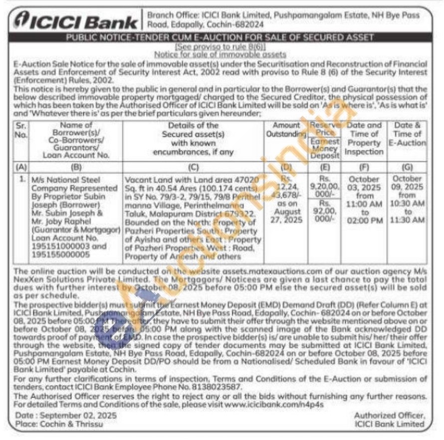 Vacant Land with Land area 47020 Sq. ft in 40.54 Ares (100.174 cents) in SY No. 79/3-2, 79/15, 79/8 Perithel manna Village, Perinthelmanna Taluk, Malapuram District 679322. Bounded on the North: Property of Pazh Pazheri Properties South: Property Property of Ayisha and others East: Property of Pazheri Properties West: Road, Property of Aneesh and others