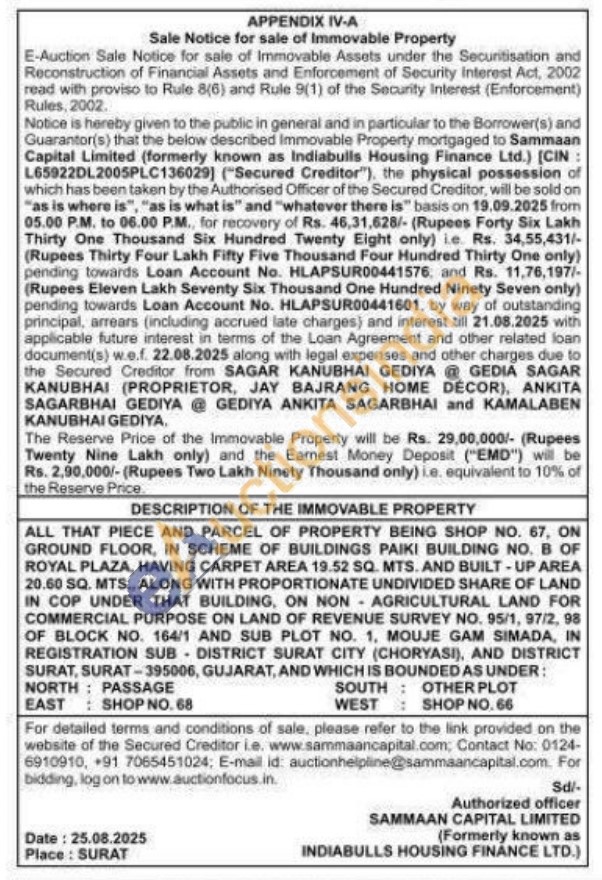 ALL THAT PIECE AND PARCEL OF PROPERTY BEING SHOP NO. 67, ON GROUND FLOOR, IN SCHEME OF BUILDINGS PAIKI BUILDING NO. B OF ROYAL PLAZA, HAVING CARPET AREA 19.52 SQ. MTS. AND BUILT-UP AREA 20.60 SQ. MTS., ALONG WITH PROPORTIONATE UNDIVIDED SHARE OF LAND IN COP UNDER THAT BUILDING, ON NON AGRICULTURAL LAND FOR COMMERCIAL PURPOSE ON LAND OF REVENUE SURVEY NO. 95/1, 97/2, 98 OF BLOCK NO. 164/1 AND SUB PLOT NO. 1, MOUJE GAM SIMADA, IN REGISTRATION SUB DISTRICT SURAT CITY (CHORYASI), AND DISTRICT SURAT, SURAT-395006, GUJARAT, AND WHICH IS BOUNDED AS UNDER: NORTH PASSAGE EAST SHOP NO. 68 SOUTH OTHER PLOT WEST : SHOP NO.66