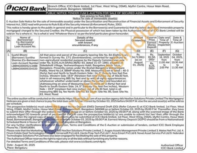 All that piece and parcel of the property bearing Site No. 84 (Eighty four). formed in Survey No. 17/1 (Seventeen/one), converted for agricultural to non-agricultural residential purpose by the Deputy Commissioner vide order No. B.DIS.ALN.SR(N) 146/92-93, dated 31-07-1993, situated at Sidedahalli Village, Yeshwanthapura Hobli, Bangalore North Taluk, Bangalore. Presently comes under the Bruhat Bangalore Mahanagara Palike, Ward No.14, BBMP Khata No. 848. Measuring East to West: 40-0 (forty) feet and North to South Eastern Side: 24.5" (twenty four feet five inches), Western Side: 19.9" (Nineteen feet nine inches) out of 40x30 feet, total in all measuring 885 Sq. feet and by with all rights appurtenances whatsoever whether underneath or above the surface and bounded on: (Admeasuring an area of Measuring East to West: 40-0 (forty) feet and North to South Eastern Side: 24.5" (twenty four feet five inches). Western Side 19.9" (nineteen feet nine inches) out of 40x30 feet, total in all measuring 885 Sq. fee North: Site No. 83 South: Site No. 85, East: Site No. 63, West: Road