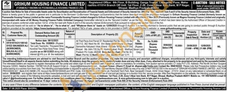 All That Piece And Parcel Of Residential Plot No 33 On Kh No 361/1/2, 362 Ward No 85 Shri Balaji Dham Phase 2 Village Samantha Kaliyasof Visas Khand Phrada Tehsil Huzur Dist Bhopal Mp Adm. 720.Sq Ft. Hoshangabad Road Madhya Pradesh Pin Code-462046 Bounded By:-East:-Plot No 34. West-Plot No 32 North: Other Land, South-Road 12 FI.