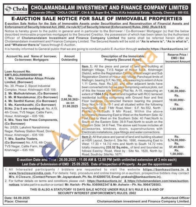 Item 1: All the piece and parcel of land and building at Mathigiri Village, TVS Nagar of Hosur Taluk, Krishnagiri District, within the Registration District of Krishnagiri and Sub Registration District of Hosur and Village Panchayat limits of Mathigiri, bearing S.F. No.555, admeasuring to extent of Acre 1.11 Cents, Asst. Rs.3.07, and other adjacent lands have been converted into house sites comprising various plots, out of this the house site bearing Plot No. A-19, measuring an extent of 1564.5 Sq. Feet of land together with RCC terraced residential building comprising with Ground floor and first Floor buildings Constructed thereon bearing the present Door Nos.A-19, A-19-1 and all situated within the following boundaries: East: 7 Mtr Road, West: S.F. No 552, North Plot No. A-18, South: 9 Mtr Road, Within the above boundaries Measuring East to West on the Northern Side: 42 Feet East to West on the Southern Side: 40 Feet North to South on the Eastern Side: 39:9 Feet, North to south on the Western Side: 34.6 Feet. The above said house includes all accessories, windows, doors, superstructures with Electricals installations, pipe fittings and water connections.