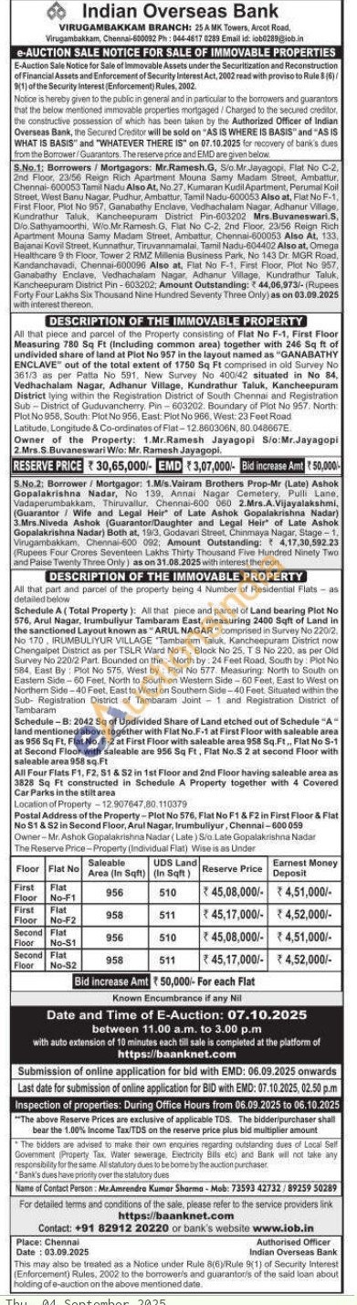 All that part and parcel of the property being 4 Number of Residential Flats - as detailed below Schedule A (Total Property): All that piece and parcel of Land bearing Plot No 576, Arul Nagar, Irumbuliyur Tambaram East, measuring 2400 Sqft of Land in the sanctioned Layout known as "ARUL NAGAR comprised in Survey No 220/2, No 170, IRUMBULIYUR VILLAGE 'Tambaram Taluk, Kancheepuram District now Chengalpet District as per TSLR Ward No F, Block No 25, TS No 220, as per Old Survey No 220/2 Part. Bounded on the North by: 24 Feet Road, South by Plot No 584, East By: Plot No 575, West by Plot No 577. Measuring: North to South on Eastern Side-60 Feet. North to South on Westom Side-60 Feet, East to West on Northem Side-40 Feet, East to West on Southern Side-40 Feet. Situated within the Sub- Registration District of Tambaram Joint1 and Registration District of Tambaram