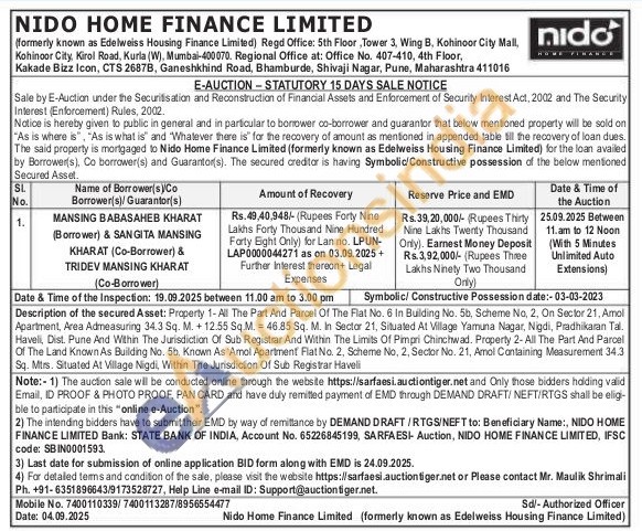 Description of the secured Asset: Property 1-All The Part And Parcel Of The Flat No. 6 In Building No. 5b, Scheme No. 2, On Sector 21, Amol Apartment, Area Admeasuring 34.3 Sq. M. +12.55 Sq.M. 46.85 Sq. M. In Sector 21, Situated At Village Yamuna Nagar, Nigdi, Pradhikaran Tal Havell, Dist. Pune And Within The Jurisdiction Of Sub Registrar And Within The Limits Of Pimpri Chinchwad. Property 2-All The Part And Parcel Of The Land Known As Building No. 5b. Known As Amol Apartment Flat No. 2, Scheme No, 2, Sector No. 21, Amol Containing Measurement 34.3 Sq. Mtrs. Situated At Village Nigdi, Within The Jurisdiction Of Sub Registrar Haveli