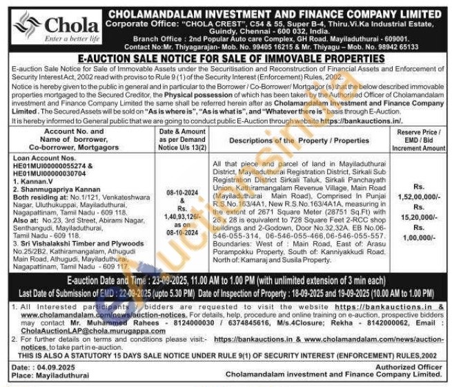 All that piece and parcel of land in Mayiladuthurai District, Mayiladuthurai Registration District, Sirkali Sub Registration District Sirkali Taluk, Sirkali Panchayath Union, Kathiramangalam Revenue Village, Main Road (Mayiladuthurai Main Road), Comprised In Punjai R.S.No. 163/4A1, New R.S.No. 163/4A1A, measuring in the extent of 2671 Square Meter (28751 Sq. Ft) with 26 x 28 is equivalent to 728 Square Feet 2-RCC shop buildings and 2-Godown, Door No.32,32A, EB No.06-546-055-314, 06-546-055-466,06-546-055-557. Boundaries: West of Main Road, East of Arasu Porampokku Property, South of: Kanniyakkudi Road. North of: Kamaraj and Susila Property.