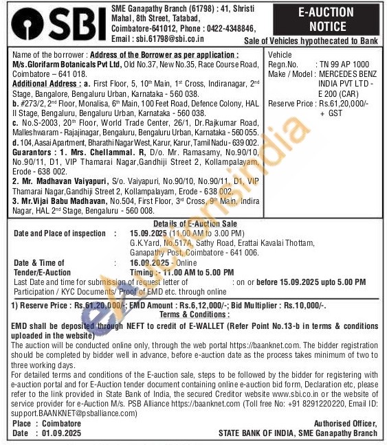 Vehicle Regn. No. : TN 99 AP 1000 Make/Model: MERCEDES BENZ INDIA PVT LTD-E 200 (CAR) Reserve Price: Rs.61,20,000/-GST