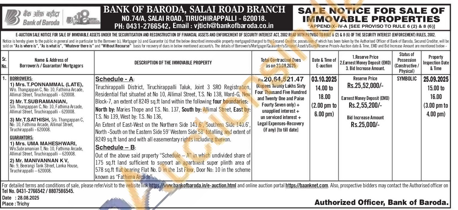 Schedule - A: Tiruchirappalli District, Tiruchirappalli Taluk, Joint 3 SRO Registration, Residential flat situated at No 10, Allimal Street, T.S. No 138, Ward-G, New Block-7, an extent of 8249 sq.ft land within the following four boundaries: North by: Maries Thope and T.S. No. 137, South by: Allimal Street, East by: T.S. No 139, West by: T.S. No 136, An Extent of East-West on the Northern Side 141.6', Southern Side 140.6', North-South on the Eastern Side 59' Western Side 58' totalling and extent of 8249 sq.ft land and with all easementary rights including thereon. Schedule - B: Out of the above said property "Schedule A" in which undivided share of 175 sq.ft land sufficient to support an apartment super plinth area of 578 sq.ft flat bearing Flat No. D in the 1st Floor, Door No: 10 in the scheme known as "Fathima Arcade".