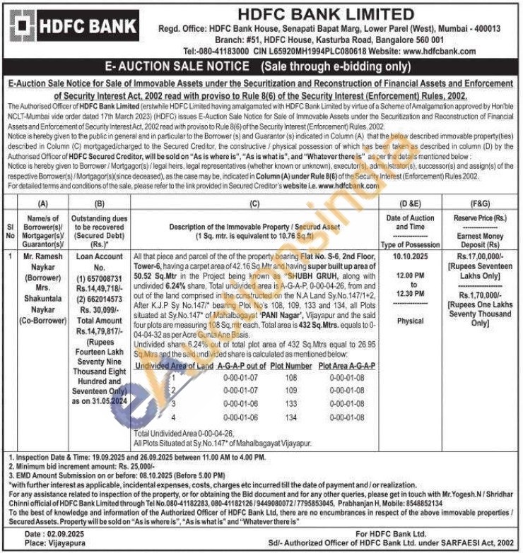 All that piece and parcel of the of the property bearing Flat No. S-6, 2nd Floor, Tower-6, having a carpet area of 42. 16 Sq.Mtr and having super built up area of 50.52 Sq.Mtr in the Project being known as "SHUBH GRUH, along with undivided 6.24% share, Total undivided area is A-G-A-P, 0-00-04-26, from and out of the land comprised in the constructed on the N.A Land Sy.No. 147/1+2, After K.J.P Sy No. 147/" bearing Plot No's 108, 109, 133 and 134, all Plots situated at Sy.No. 147" of Mahalbagayat 'PANI Nagar', Vijayapur and the said four plots are measuring 108 Sq.mtr each, Total area is 432 Sq.Mtrs. equals to 0-04-04-32 as per Acre Gunta Ane Basis.Undivided share 6.24% out of total plot area of 432 Sq.Mtrs equal to 26.95 Sq.Mtrs and the said undivided share is calculated as mentioned below:Undivided Area of Land A-G-A-P out of Plot Number Plot Area A-G-A-PA-G-A-P out of Plot Number Plot Area A-G-A-P Thousand Eight Hundred and 1 Seventeen Only) 2 as on 31.05.2024 3 4 0-00-01-07 108 0-00-01-08 0-00-01-07 109 0-00-01-08 0-00-01-06 133 0-00-01-08 0-00-01-06 134 0-00-01-08