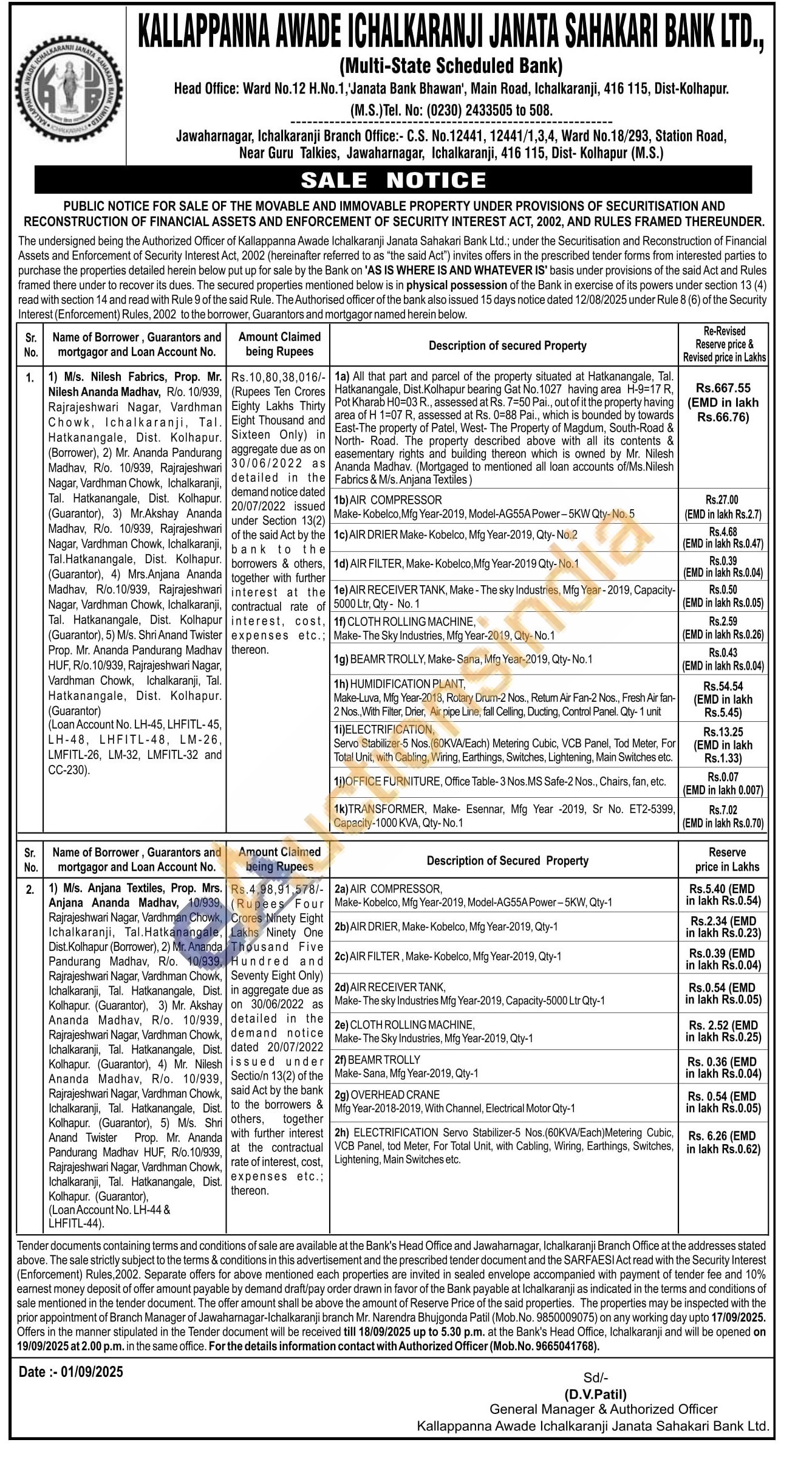 1a) All that part and parcel of the property situated at Hatkanangale, Tal. Hatkanangale, Dist. Kolhapur bearing Gat No. 1027 having area H-9-17 R, Pot Kharab H0=03 R., assessed at Rs. 7=50 Pai., out of it the property having area of H 1=07 R, assessed at Rs. 0-88 Pai., which is bounded by towards East-The property of Patel, West- The Property of Magdum, South-Road & North- Road. The property described above with all its contents & easementary rights and building thereon which is owned by Mr. Nilesh Ananda Madhav. (Mortgaged to mentioned all loan accounts of/Ms.Nilesh Fabrics & M/s. Anjana Textiles)