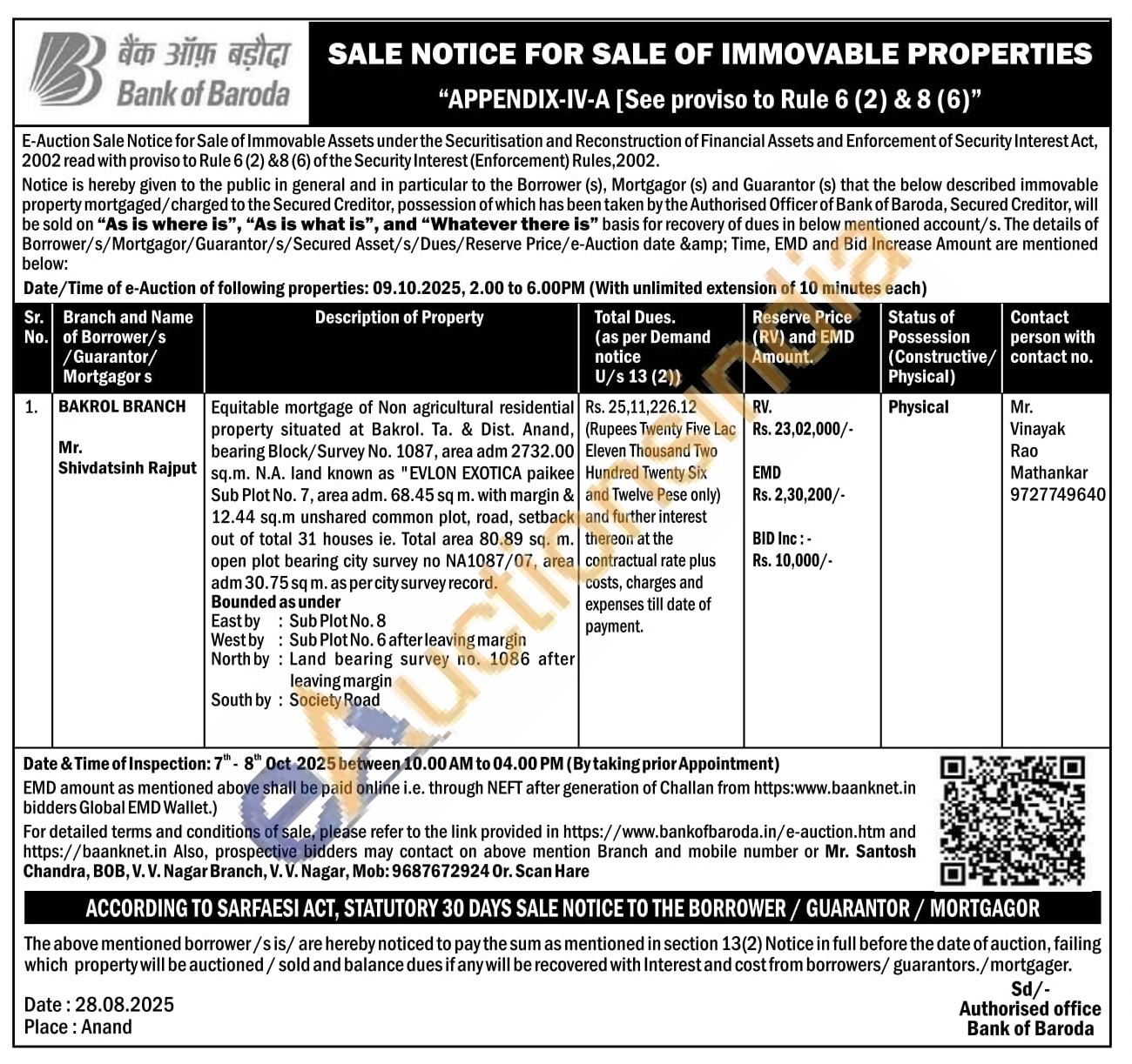 Equitable mortgage of Non agricultural residential property situated at Bakrol. Ta. & Dist. Anand, bearing Block/Survey No. 1087, area adm 2732.00 sq.m. N.A. land known as "EVLON EXOTICA paikee Sub Plot No. 7, area adm. 68.45 sq m. with margin & 12.44 sq.m unshared common plot, road, setback out of total 31 houses ie. Total area 80.89 sq. m. open plot bearing city survey no NA1087/07, area adm 30.75 sq m. as per city survey record