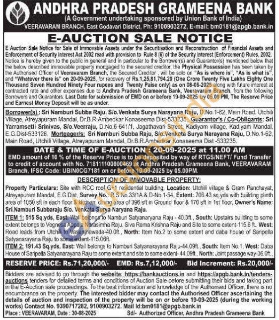 Property Particulars: Site with RCC roof G+1 residential building, Location: Utchili village & Gram Panchayat, Atreyapuram Mandal, E.G.Dist, Survey No.: R.S.No.33/1A & D-No. 1-54, Extent: 706.43 sq.yds with building plinth area of 1050 sft in each floor & kitchen, dining area of 396 sft in Ground floor & 170 sft in 1st floor, Owner's Name: Sri.Namburi Subbaraju S/o. Venkata Surya Naryana Raju.