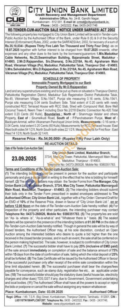 Land and any superstructure existing and to be put up there on situated in Thanjavur District, Pattukkottai Registration District, Madukkur Sub Registration District Pattukkottai Taluk No.45, Vikkramam Village, S.No 154/7, Punjai site measuring 0.16 cents, S.No. 154/1, Punjal site measuring 0.04 cents Southem Side. Total extent of 0.20 cents with newly constructed RCC Terraced House with RCC Slab, Shed with Compound Wall, Bore Well Coconut Trees-6, Neem Tree-1 including Door No.2/218 Electric Connection No.420. Total extent 0.20 Cents (60 Kulis). Boundaries: North of Shanmuga Velalar and others Property, East of: Sirumelkudi Road, South of P.Panchatsaram Punjai, West of: Backiyam Ammal, within Vikaramam Panchayat Union limits, Measurements: 0.16 cents 0.04 Cents, total extent 0.20 Cents (60 Kulis) Measurements for RCC Terraced house: East West both sides 54 1/2 ft, North South both sides 22 1/2 ft Measurements for First floor: East West 14 1/2 ft. North South 32 1/4 ft.