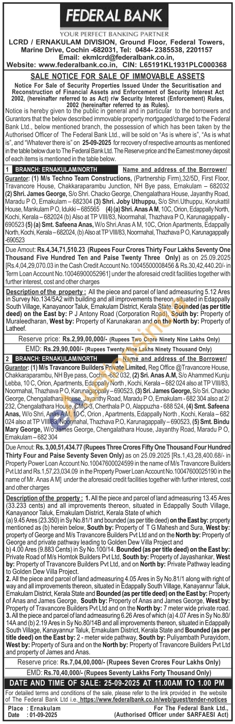 All the piece and parcel of land admeasuring 5.12 Ares in Survey No. 134/5A2 with building and all improvements thereon, situated in Edappally South Village, Kanayanoor Taluk, Ernakulam District, Kerala Stale. Bounded (as per title deed) on the East by: PJ Antony Road (Corporation Road). South by: Property of Muraleedharan, West by: Property of Karunakaran and on the North by: Property of Latheef.
