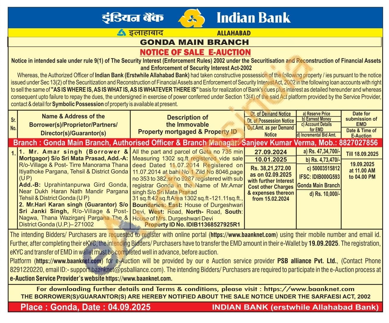 All the part and parcel of Gata no 735 min Measuring 1302 sq.ft registered vide sale deed Dated 11.07.2014 Registered on 11.07.2014 at bahi No 1 Zild No 8046,page no 353 to 382, sr no 9287 registered with sub registrar Gonda in the Name of Mr.Amar singh S/o Sri Mata Prasad 31 sq.ft 42 sq.ft Area 1302 sq.ft-121.11sq.ft., Boundaries: East: House of Durgeshwari Devi, West: Road, North Road, South: House of Mrs. Durgeshwari Devi