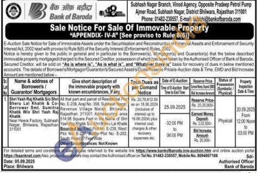Al that part and parcel of Residential Plot -No. E-238, Arai No. 361. Subhash Nagar, Revenue Village Malan, Bhilwara Rajasthan 311001 Admeasuring area 514.98 Square Feet in the Name of Shr Yash Raj Khatik Sib Shri Bheru Lal Khatik Bounded by- East Plot No. E-239, West Plot No E-237, North Plot No E-202 South Road 17 Feet Wide Other Encumbrances. Not Known