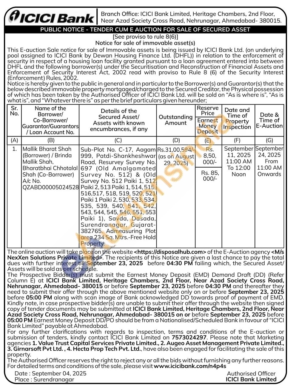 Sub-Plot No. C-17, Aagam 999, Patdi-Shankheshwar Road, Resurvey Survey No. 697 (Old Amalgamated Survey No. 512) & (Old) Survey No. 512 Paiki 1, 512 Paiki 2, 513 Paiki 1, 514,515, 516,517, 518, 519, 520, 521 Paiki 1 Paiki 2, 530, 533,534, 535, 539, 540, 541, 542, 543, 544, 545, 546, 551, 553 Paiki 1), Savda, Dasada, Surendranagar, Gujarat-382765. Admeasuring Plot area 234 Sq. Mtrs.-Free Hold Property.