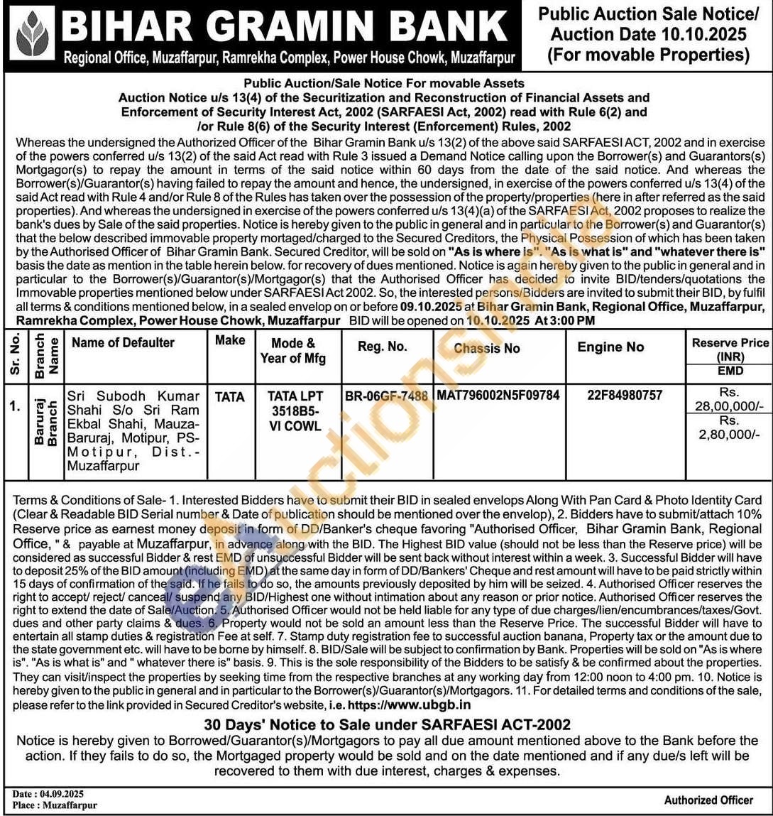 Mode & Year of Mfg : TATA LPT 3518B5-VI COWL